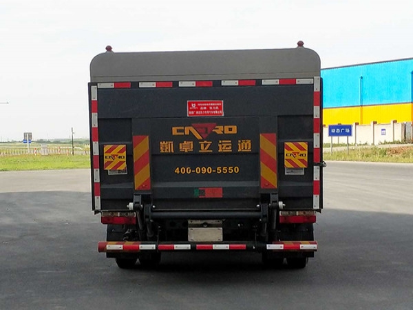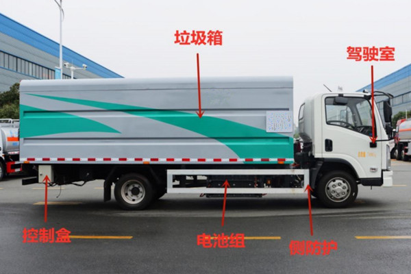 其它 | 1.該車裝備有垃圾箱體,液壓升降頂蓋,液壓尾板等專用裝置,用于實現垃圾桶的裝卸及運輸功能,頂蓋可向上開啟;2.尾板質量為:450kg,尾板收起的水平狀態為:200mm;3.側面防護裝置材料為鋁合金,連接方式為螺栓連接,后下部防護裝置為圓形管材料為Q235B,連接方式:螺栓連接,后部防護裝置截面尺寸為直徑110mm,離地高度:440mm;4.儲能裝置類型/生產廠家:磷酸鐵鋰電池/寧德時代新能源科技股份有限公司;電機額定功率/峰值功率:60kW/110kW;5.ABS型號/生產廠商為:ABS/ASR-12V-4S/4M/襄陽東風隆誠機械有限公司.6.該車型可選裝車載ETC裝置;7.該車型選裝不同尺寸的垃圾箱體,標準型時整車長:6650mm,整車寬為:2100mm/2140mm,整車高:2520mm,后懸:1672mm加長型箱體時整車長:6750mm/6850mm,整車寬為:2140mm/2200mm,整車高:2615mm/2710mm,后懸:1772mm/1872mm,標準型與加長型箱體整備質量在誤差范圍內,忽略不計;8.該車型可選裝輕量化箱體,整備質量/額定載質量:5200kg/3100kg,隨底盤選裝駕駛室外觀.選裝后部外觀結構 | ||