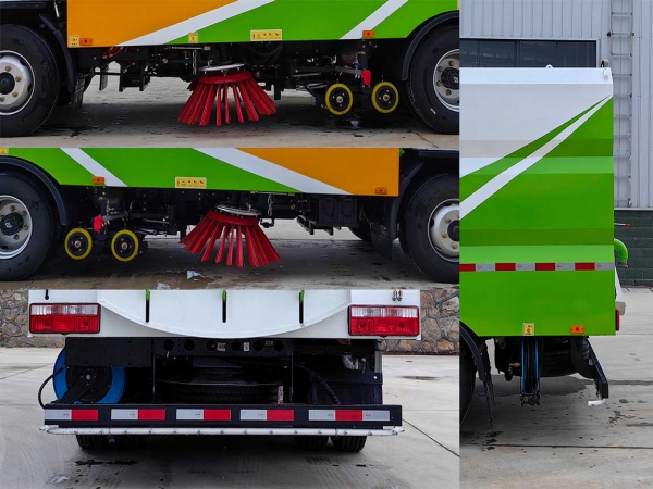 (2) 該車(chē)集掃路車(chē)、灑水車(chē)和高壓清洗車(chē)功能于一體,具備路面清掃、路面洗刷、高壓清洗、低壓沖洗、路緣石洗刷、垃圾收集、污水回收、噴霧降塵和道路隔離墻清洗、小廣告清洗等多種作業(yè)功能。