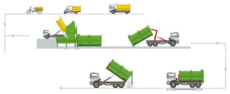 后平臺分體式水平壓縮垃圾處理站設備,一般采用一機兩箱的配置,即一個壓縮主機兩個壓縮垃圾箱。該設備主要建設在生活小區、街道、農村、鄉鎮等,對垃圾的集中清理轉運。